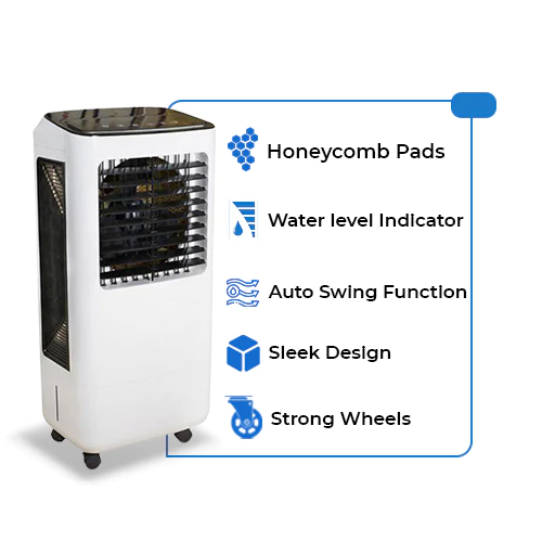 The BM6 Optimum desert cooler by Cool Master UAE is a compact and efficient cooling solution for both residential and commercial use. With three speed settings and an air delivery of 6000 m³/h, it can cool an area of up to 300 sq ft. It features a 69 L water tank, ice chamber, oscillating function, and four castor wheels for easy mobility. Other convenient features include an empty tank alarm, water level indicator, and dust filter. The BM6 Optimum is designed for indoor and outdoor use and is inverter compatible, making it an energy-efficient choice